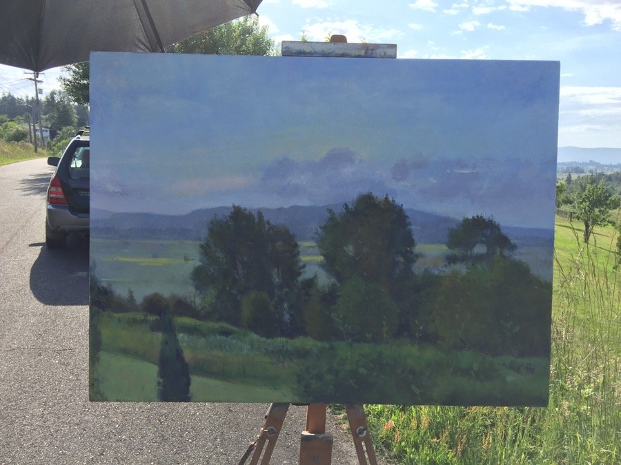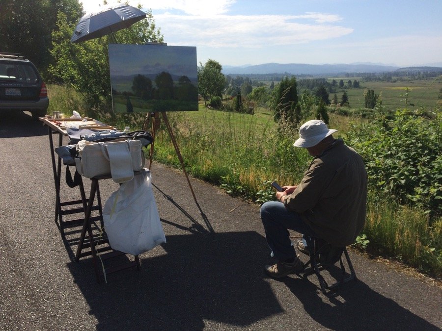 More Snohomish Valley morning plein air. We arrived at 7am, and much of the work was done from 7 - 8:30. The photos were taken about 9am, including the one that shows me writing this post and uploading the photos. How's that for a kind of mirror-on-mirror time maze thing?