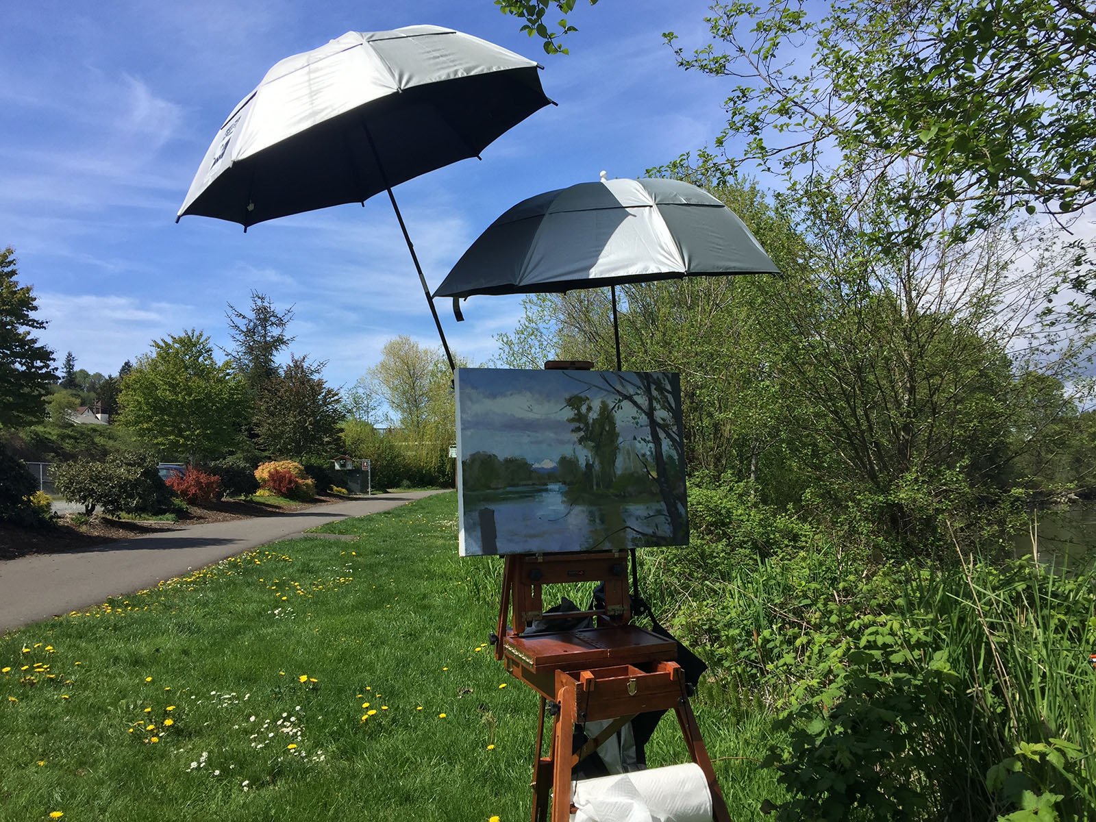 We are painting in Rotary Park, alongside River Road, with Bin Li and Karen Barkley. This is the second session, last week being the first, and attended by Bin, Karen and Julie Stonebraker. The Sun also attended both days, but Mt. Baker only attended the first session.